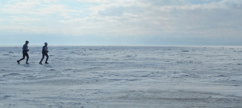 La suite est plus favorable avec une neige assez compacte, sur 2 ou 3 cm d’épaisseur. Il y a en général deux traces praticables ce qui permet de répartir les coureurs, d’éviter les bouchons et de doubler sans effort superflu. Chacun prend rapidement sa place et chemine à son rythme. On passe un pont de bois installé pour sécuriser le passage d’une crevasse. Çà et là, de la glace s’accumule en petits blocs et les franchir s’apparente à du cross-country. Les ravitaillements sont proposées grâce aux hovercrafts qui amènent du thé, des fruits secs, du chocolat, de l’eau.