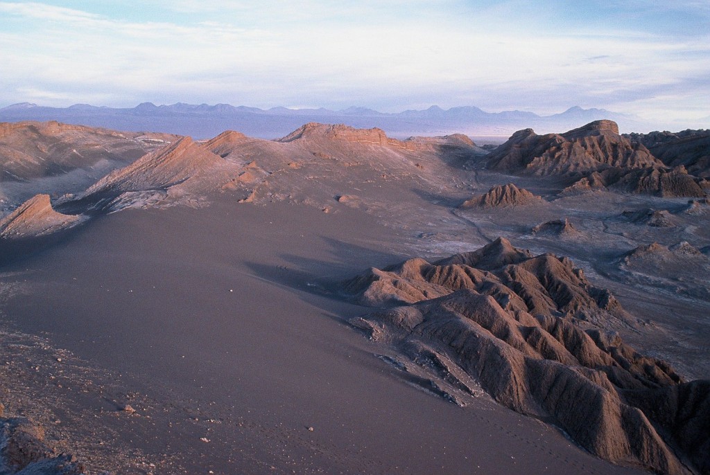 Nous effectuons l’incontournable excursion dans la Vallée de la Lune, située dans le prolongement de la Cordillère de Sel. Elle présente des reliefs étonnants formés par le sel cristallisé, parfois sous forme de croûte ou bien de « sucre glace » recouvrant le sol, ou de reliefs sculptés sur les flancs de falaises style « chou-fleur ». Blocs et écorces de sel, blancs à l’origine puis colorés par la poussière et le sable apportés par le vent. Gorges, canyons, plateaux… dunes par endroits… dans la lumière chaude et orangée de la fin d’après-midi puis du soleil couchant, dans une atmosphère transparente, avec en toile de fond le Licancabur. La lune se lève ; l’endroit, minéral, est exceptionnellement aride.