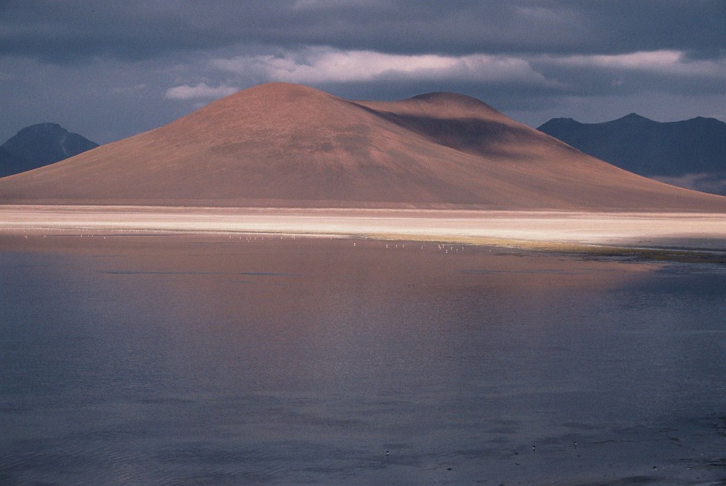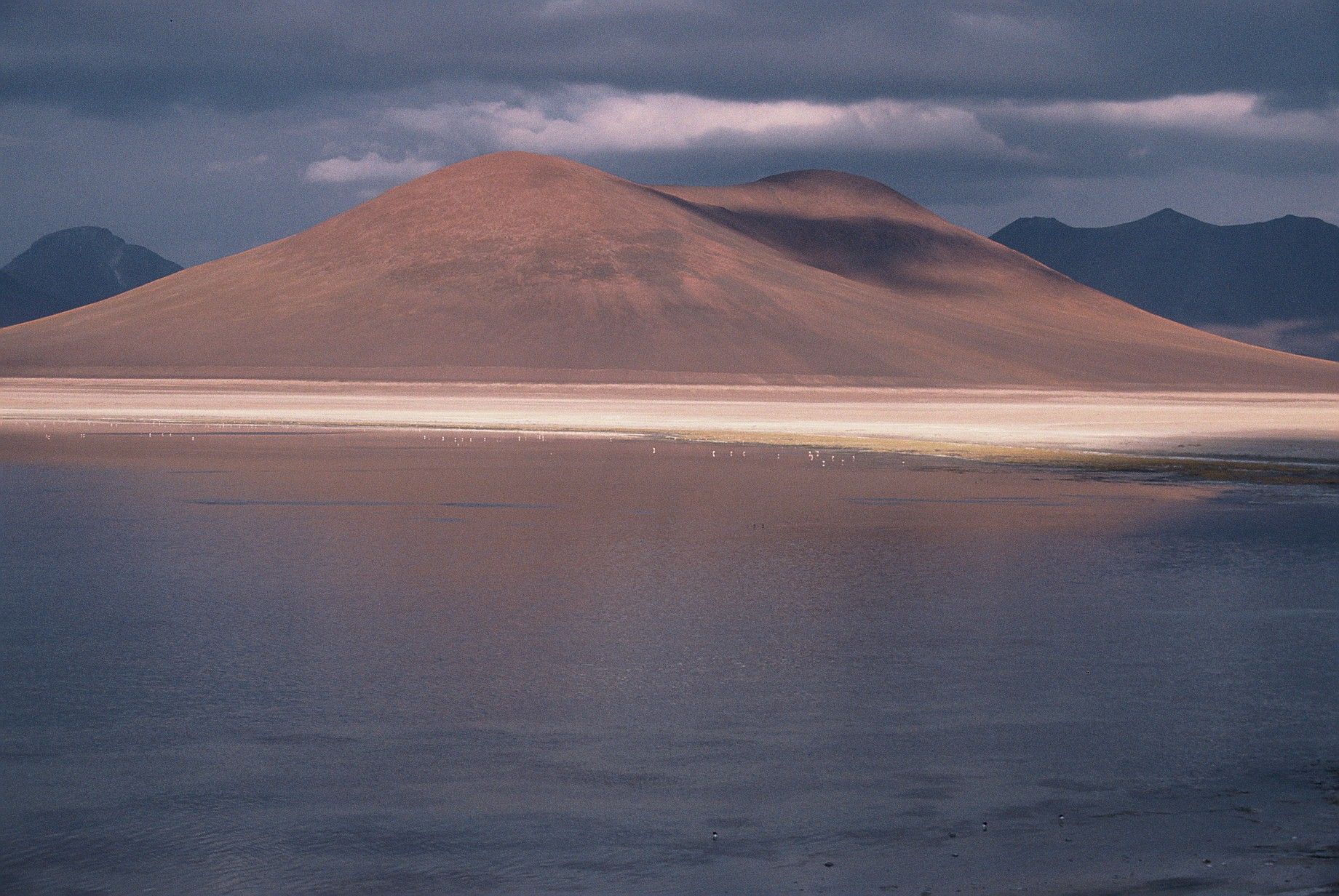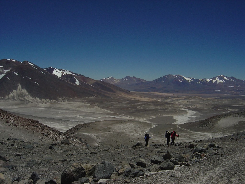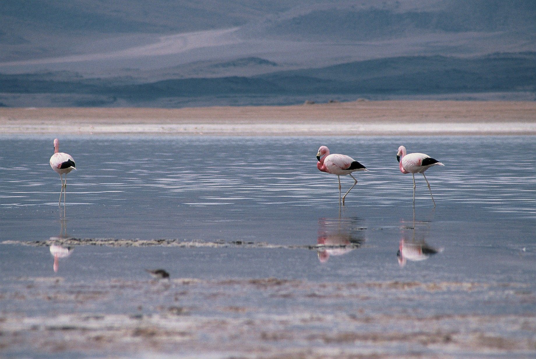 Un trek de quatre jours nous mène le long d’une rivière que nous traversons plusieurs fois et qui se trouve au fond d’une vallée surplombée de hautes falaises de terre ocre. Des trous dans la falaise marquent l’entrée d’une mine de cuivre désaffectée. Quelques ruines de maisons aux murs de galets ainsi que des fenêtres de maisons troglodytes agrémentent le paysage. Puis nous quittons le lit de la rivière et le fond de vallée pour monter à flanc de colline et gagner une crête où nous accueille une brise bien agréable. De là, le sentier joue aux montagnes russes. Certains d’entre nous qui connaissent l’Altlas s’y reconnaissent tout à fait. Des cactus apparaissent, d’abord rares, puis en nombre, se dressant dans les pentes d’éboulis et de rochers brisés. Il n’y a aucune faune à part des lézards, et plus tard des lamas, quand nous approchons d’une lagune entourée de quelques espaces verts. Des flamants roses sont groupés de l’autre côté de la lagune : l’un d’entre nous siffle et fait s’envoler les oiseaux qui volent en escadrille, font des tours au-dessus du marais et de nos têtes, passent et repassent devant nous : magique ! Ce sont des flamants andins, avec des plumes rouges sous les ailes et le corps rose pâle.