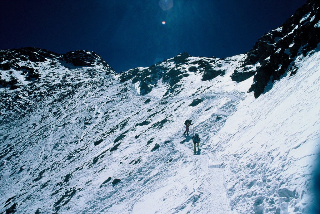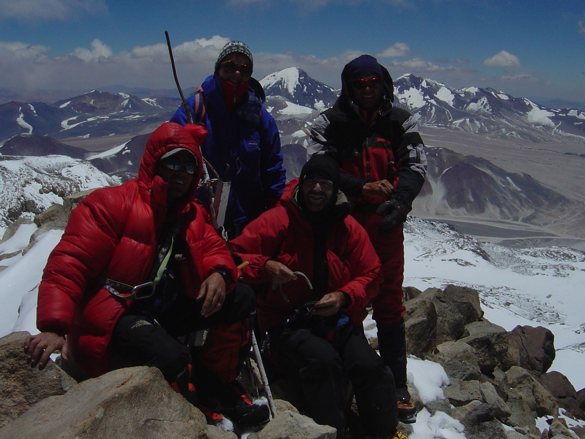 Après une marche facile, nous installons le camp 2 à 5880m, à proximité du refuge. A l’heure du réveil, il fait –12° à vue de nez. Le froid et la nuit, ainsi qu’un sentier raide et meuble, sont nos principaux ennemis jusqu’à ce que le jour se lève et le soleil chauffe. Après une heure de marche, nous trouvons soleil et neige. Le temps est magnifique, sans un nuage, et le vent reste modéré ; le froid, par contre, est vif. Nous marchons environ 45 minutes entre chaque pause, au pas de métronome de Manu. Cinq personnes du groupe ont déjà renoncé. Vers 10h30, nous sommes à 6550m en haut de la grande pente de neige et attaquons la traversée vers une épaule. Il faut être vigilants pour ne pas glisser. Nous rejoignons un groupe de Vénézuéliens et les suivons en remontant une trace raide le long de l’épaule. On se croirait sur l’autoroute du sud un jour de départ en vacances ! La pente est raide jusqu’au bord du cratère de l’Ojos, d’une circonférence d’environ 100 mètres, totalement plat et recouvert de neige. De l’autre côté du cratère, en face de nous, une pente de rochers brisés donne accès à un col d’où l’on gagne facilement le sommet. Bruno et José sont très fatigués. En les regardant, on croirait voir un remake de « On a marché sur la Lune ». Manu et moi les haranguons, les poussons pour qu’ils ne s’arrêtent pas et continuent à mettre un pied devant l’autre, mètre après mètre. Au-dessous du col, il y a une longueur en rocher. Une corde fixe est installée. Il suffit ensuite de suivre le fil d’une arête également équipée d’une corde fixe ; une trentaine de mètres plus loin, nous arrivons au sommet, marqué par une croix ! Sommet ! Au loin, des plateaux à perte de vue, quelques volcans parfois enneigés. En face de nous, à deux pas, le sommet argentin de l’Ojos, tas de cailloux un peu plus bas que le sommet chilien. Sommet, le premier de l’année !