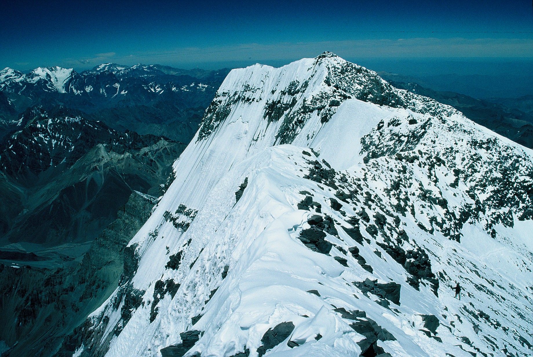 J’ai trouvé la montagne moins moche que ce que l’on m’avait décrit, voire franchement belle sur son arête sommitale. Bénéficiant pleinement de l’acclimatation acquise à l’Ojos des Salado, je suis montée sans trop de peine même si je n’ai pas couru sur les derniers 80 mètres qui le placent au-dessus de l’Ojos. Nous étions deux, les premiers ce 28 janvier à midi au sommet de l’Aconcagua, par une météo exceptionnelle (-10 degrés au sommet, vent modéré, pas un nuage), admirant la face Sud devant nous.