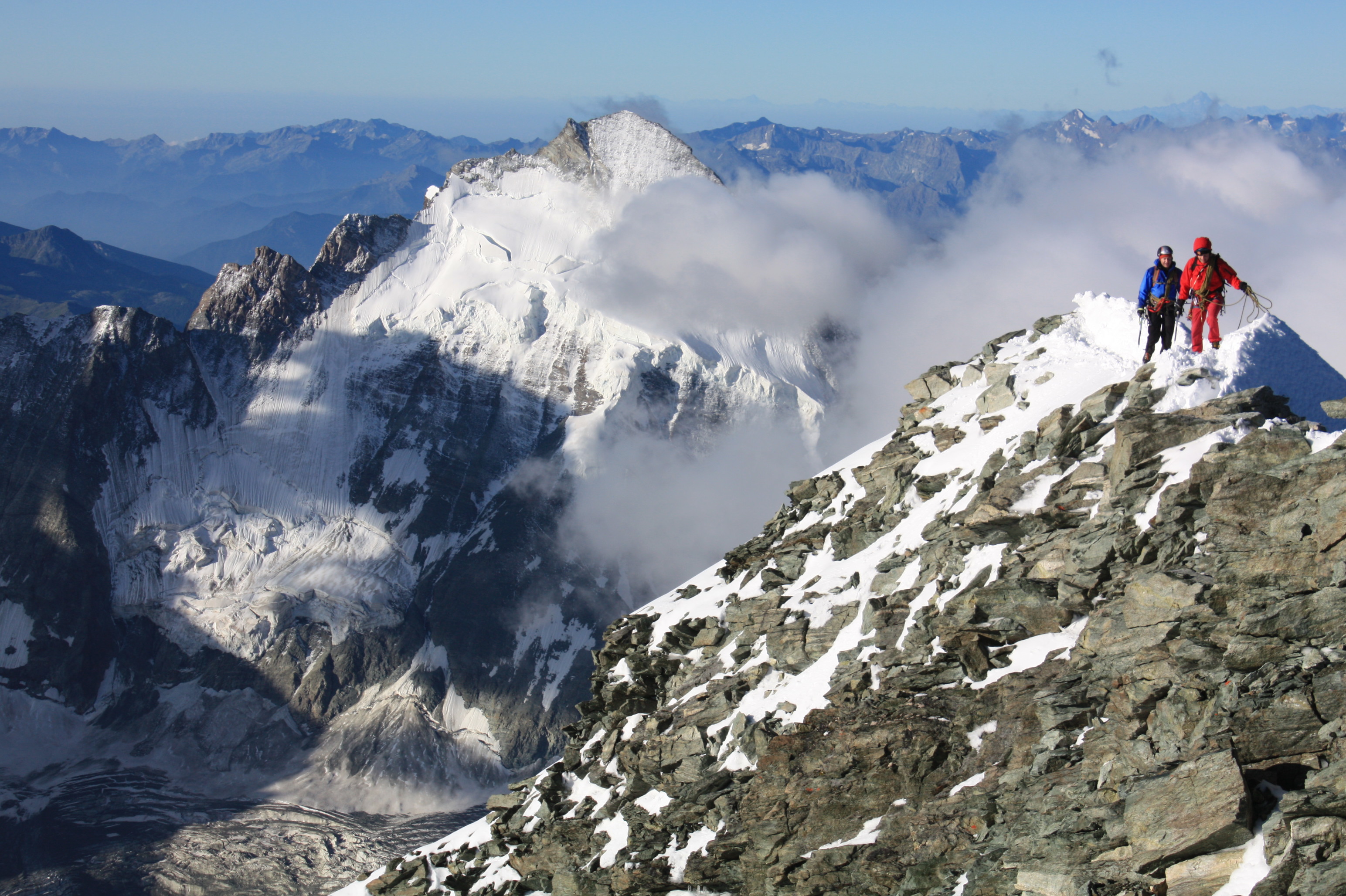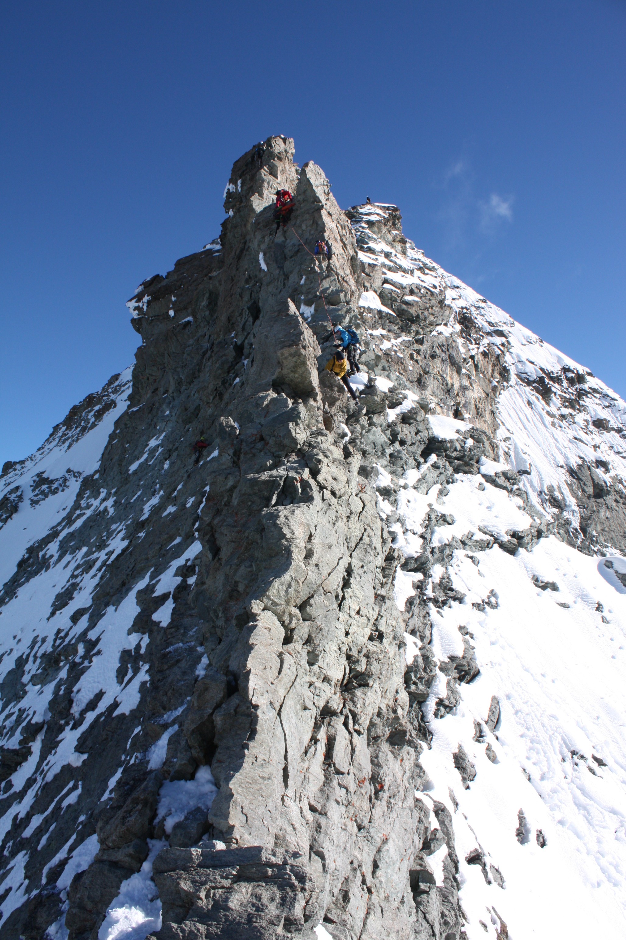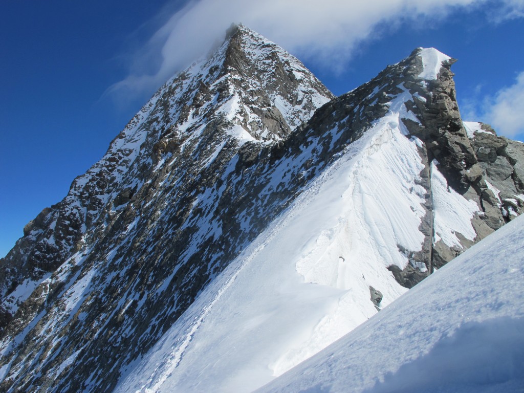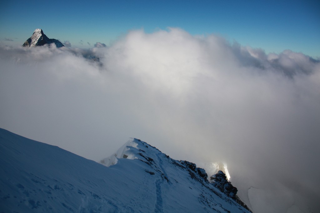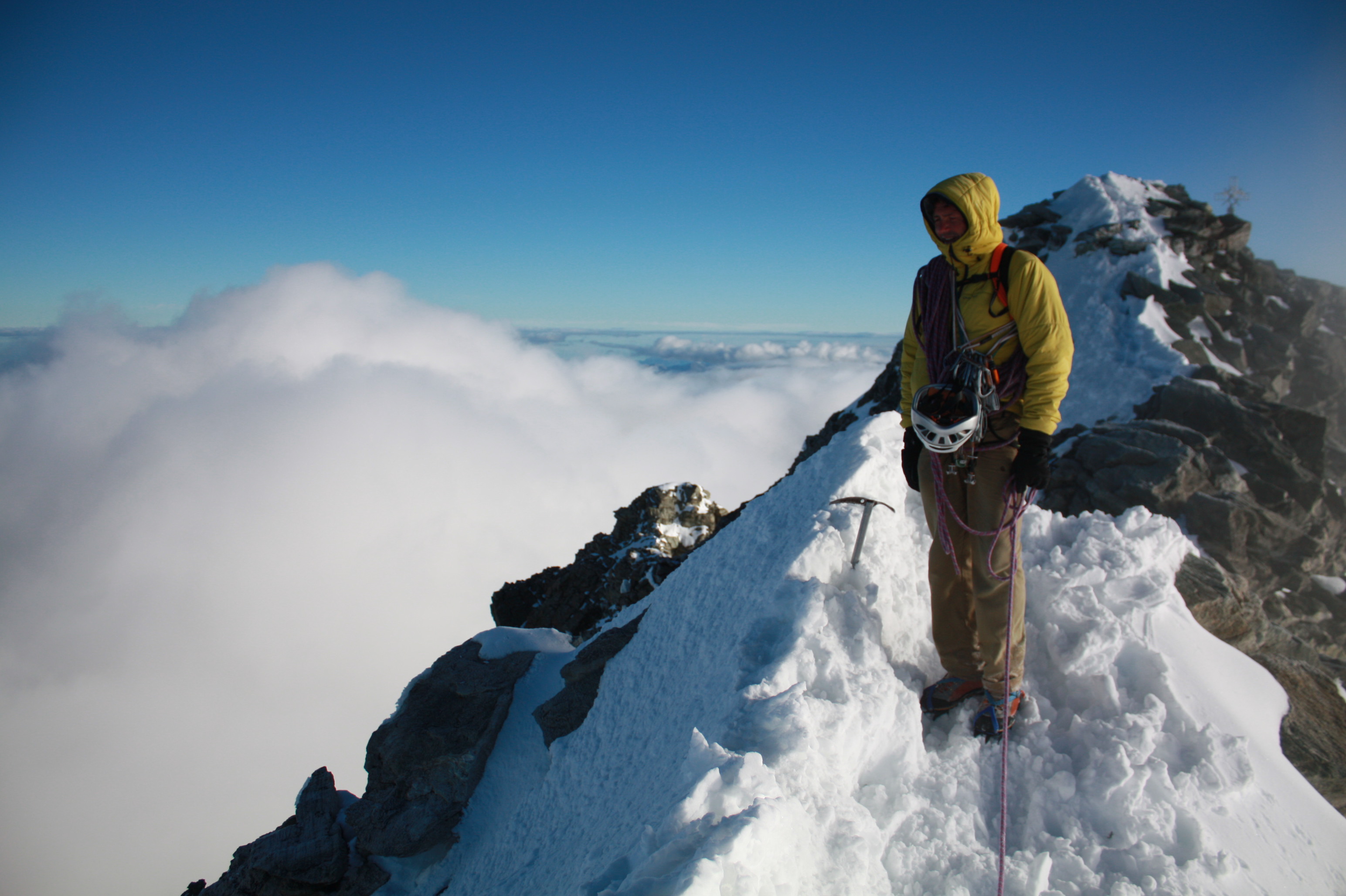 Premier ressaut rocheux avalé, puis crampons et partie de neige avant de retrouver les rochers. En réalité, on ne quittera pas les crampons en ce début août qui connaît une quantité inhabituelle de neige sur les sommets – mauvaise météo récente oblige. Nous gardons le rythme de départ et les cordées s’échelonnent sur l’arête. Nous sommes dans le brouillard sur la première partie de l’arête et le vent souffle, il fait assez frisquet. Le rocher est sain, ça grimpe bien. Le vent et le brouillard perdurent jusqu’aux derniers mètres en neige menant à  l’arête sommitale. Là, tout se découvre subitement et laissent apparaître le Cervin qui sort d’une mer de nuages, comme le Grand Combin et le Mont Blanc à l’horizon. Devant nous, une arête en neige aérienne mène à une croix : quel sommet superbe ! Quel cadre pour grimper, c’est assez exceptionnel !