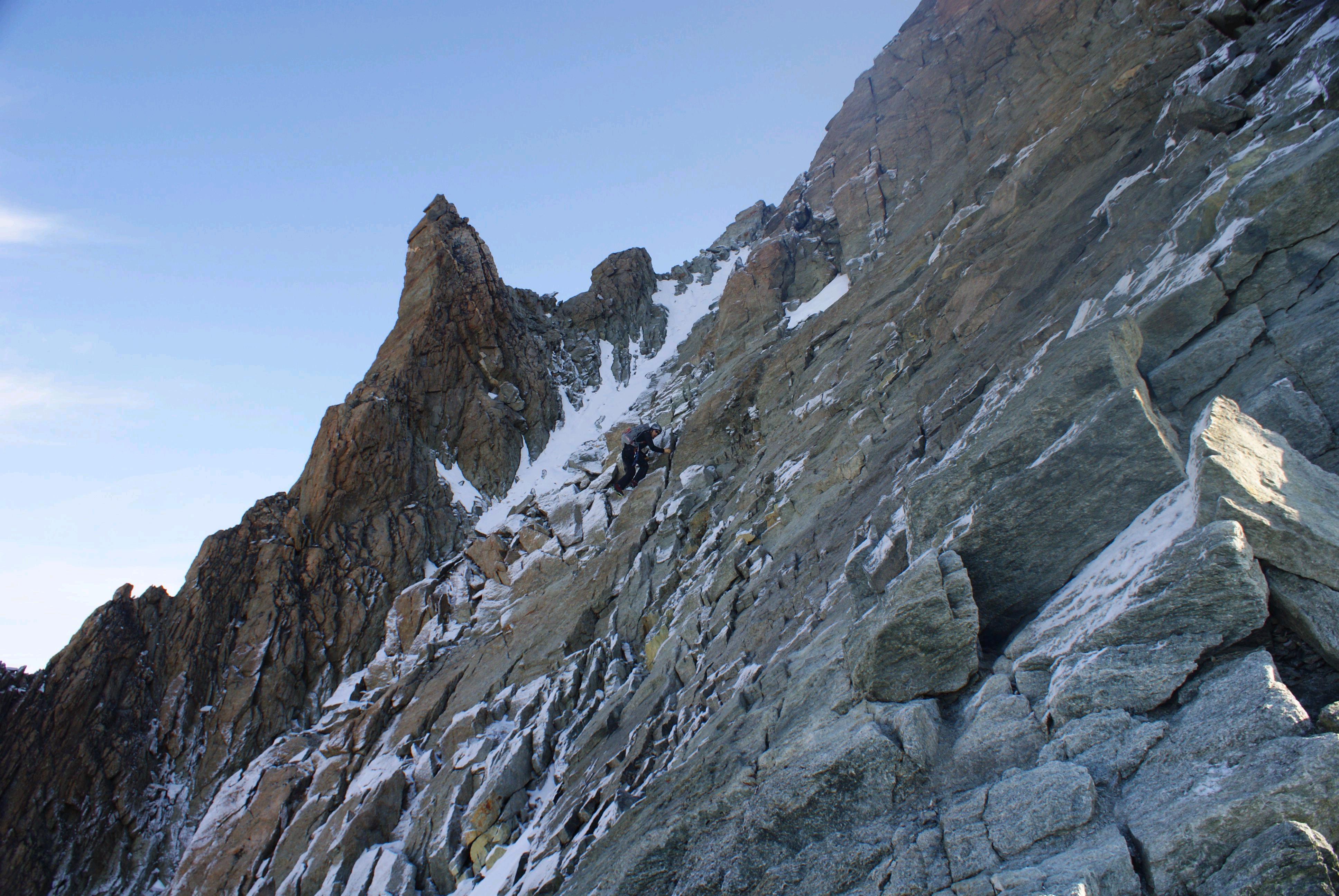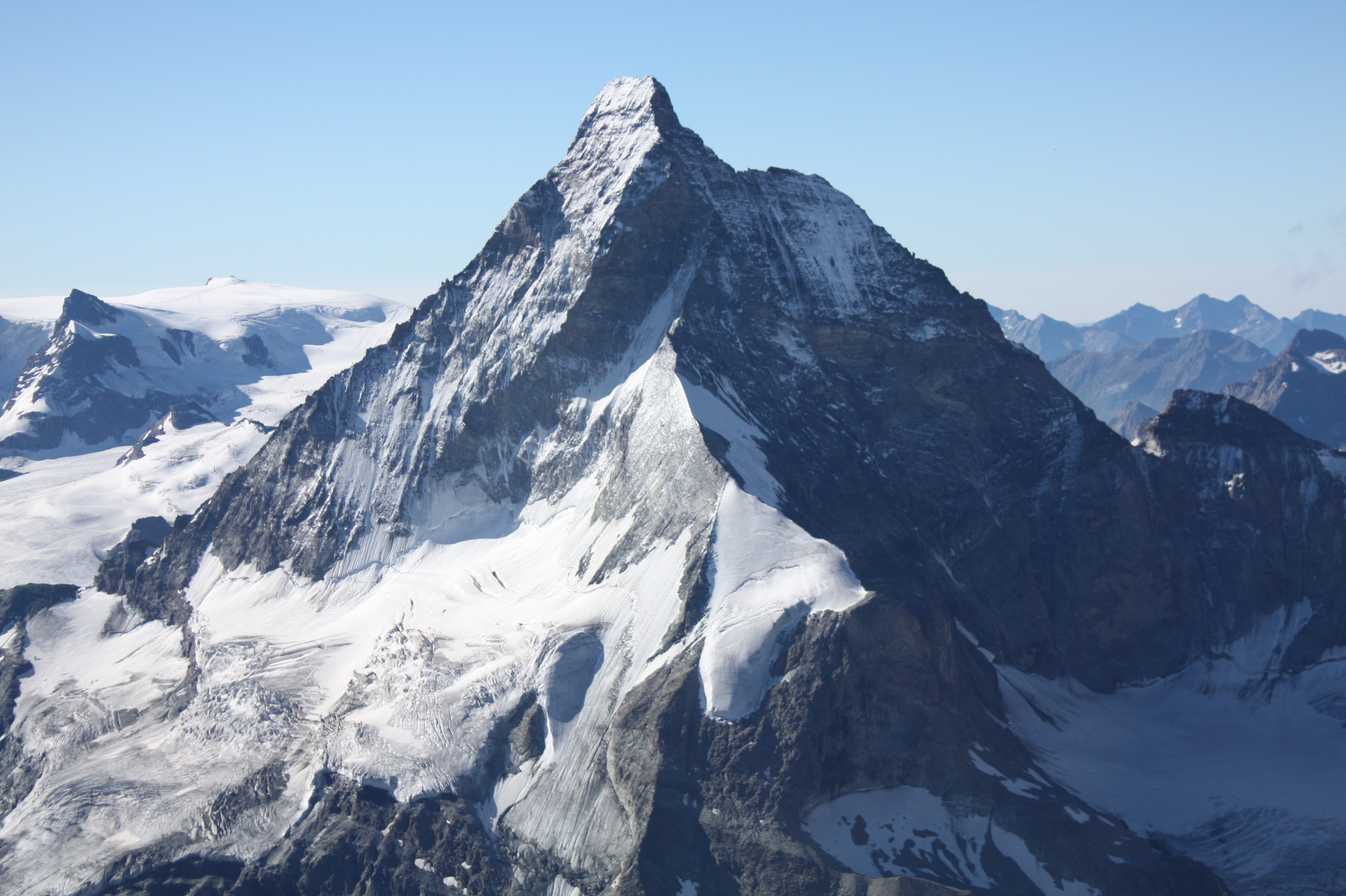 On mettra quasiment aussi longtemps pour descendre (3h) que pour monter (4h), puisque nous avons fait un reportage photo : l’arête et le Cervin, l’arête et la Dent d’Hérens, le Cervin et le Mont Rose, tout en même temps sur la même photo… euh non, ça c’est pas possible, je n’ai pas un angle assez grand sur l’appareil… Je m’en mets plein les mirettes avec ce paysage exceptionnel que, Français, on a peu l’habitude de voir. Et me promets de revenir un jour grimper la dent d’Hérens.