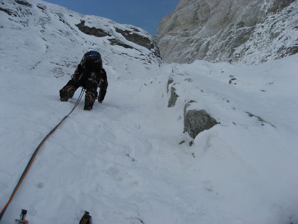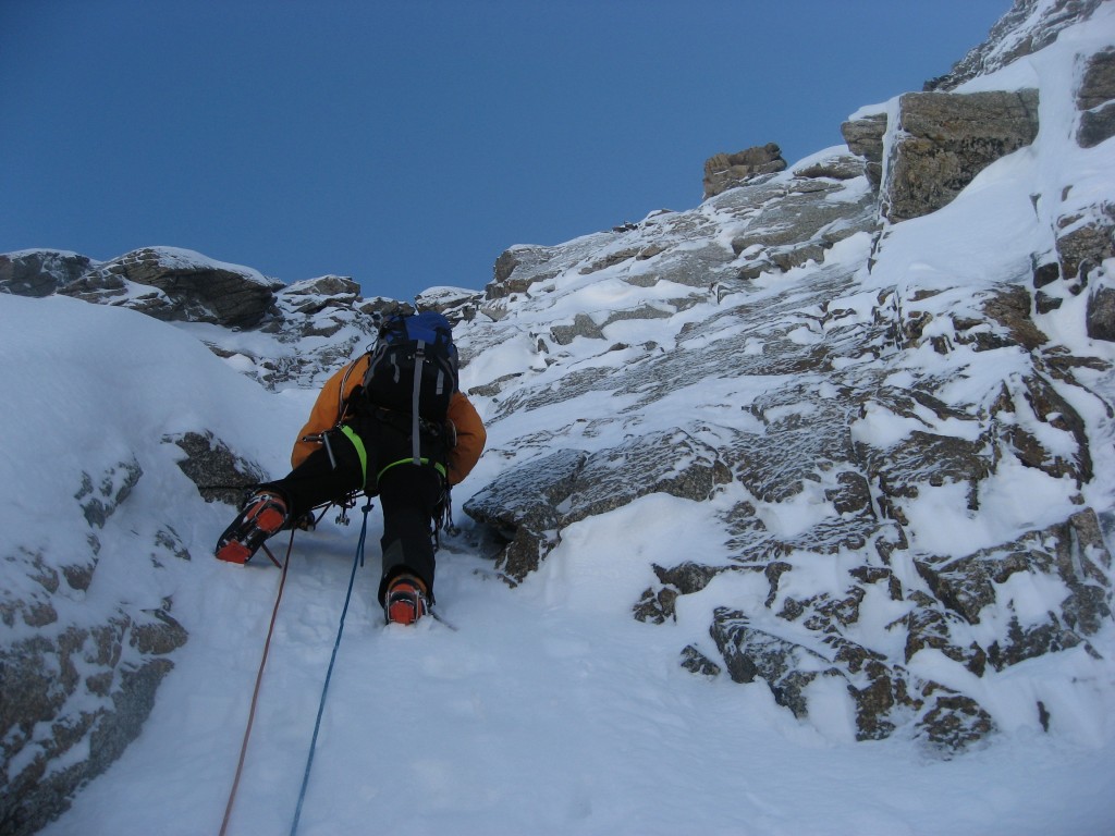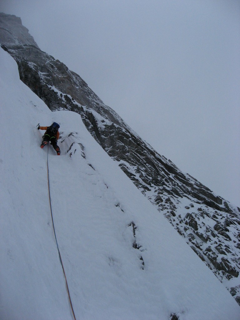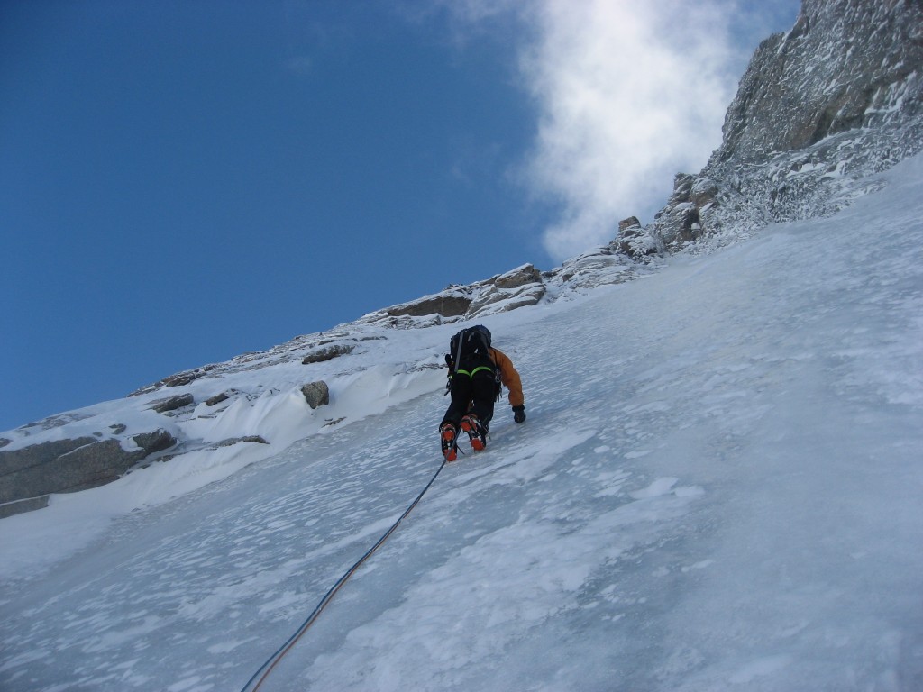 Jean traverse une pente de glace, puis mène deux longueurs en neige où la chaussure mord sur la moitié de la semelle : quel confort ! On pourrait presque penser à faire de la corde tendue, jusqu’à ce que les marches de Jean cèdent sous mon poids : vais-je devoir me mettre au régime ?? La neige n’est pas consistante et il faut rester vigilant.
