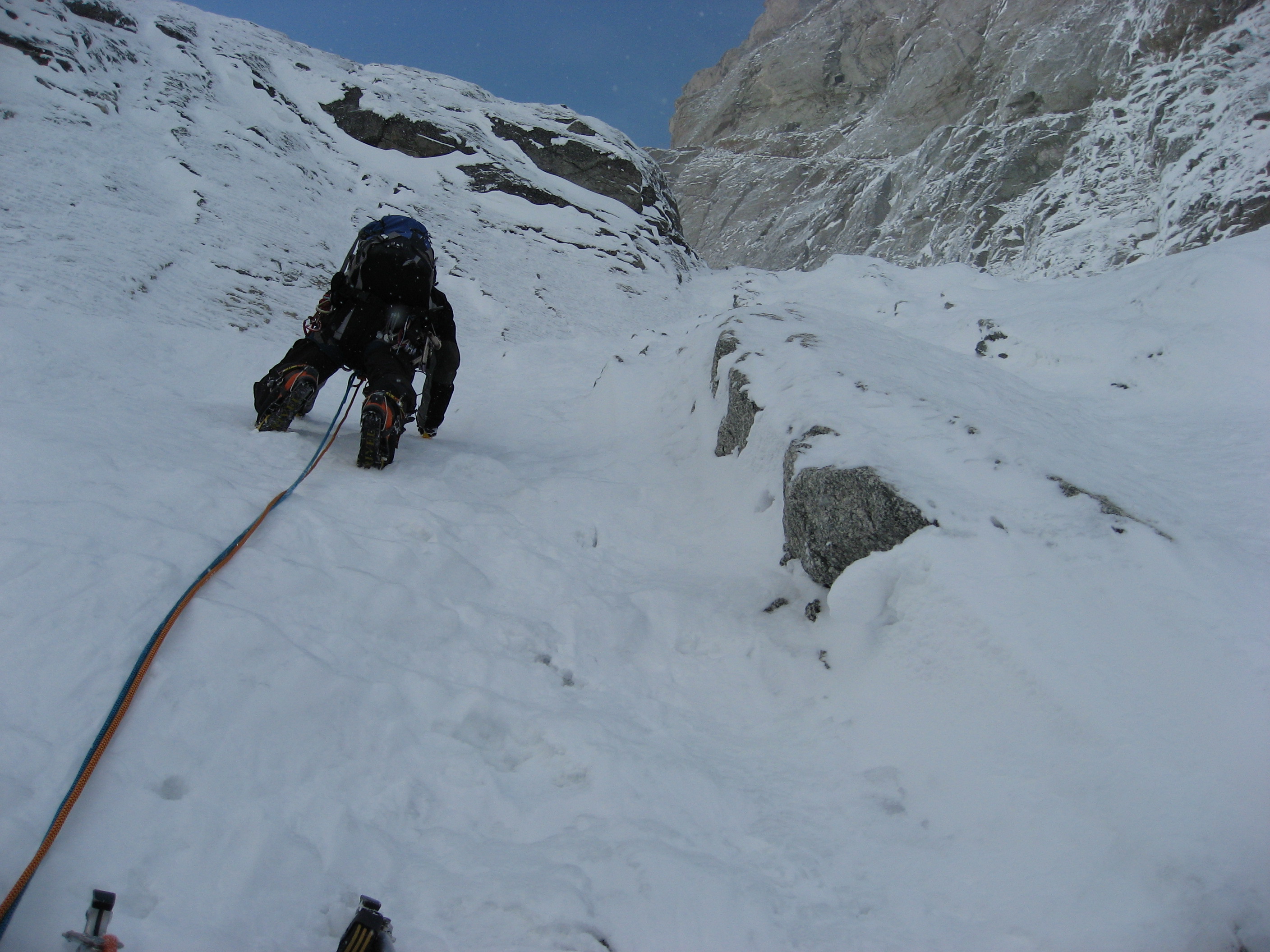 Nous sommes au pied de la pente. Elle et en glace avec ici et là de minces bandes de neige. Bonne surprise : la glace est relativement tendre, les piolets plantent facilement et les crampons mordent bien. Heureusement car nous sommes à environ 3550 mètres, à mi-chemin dans la face : il nous reste 400 mètres de dénivelée !