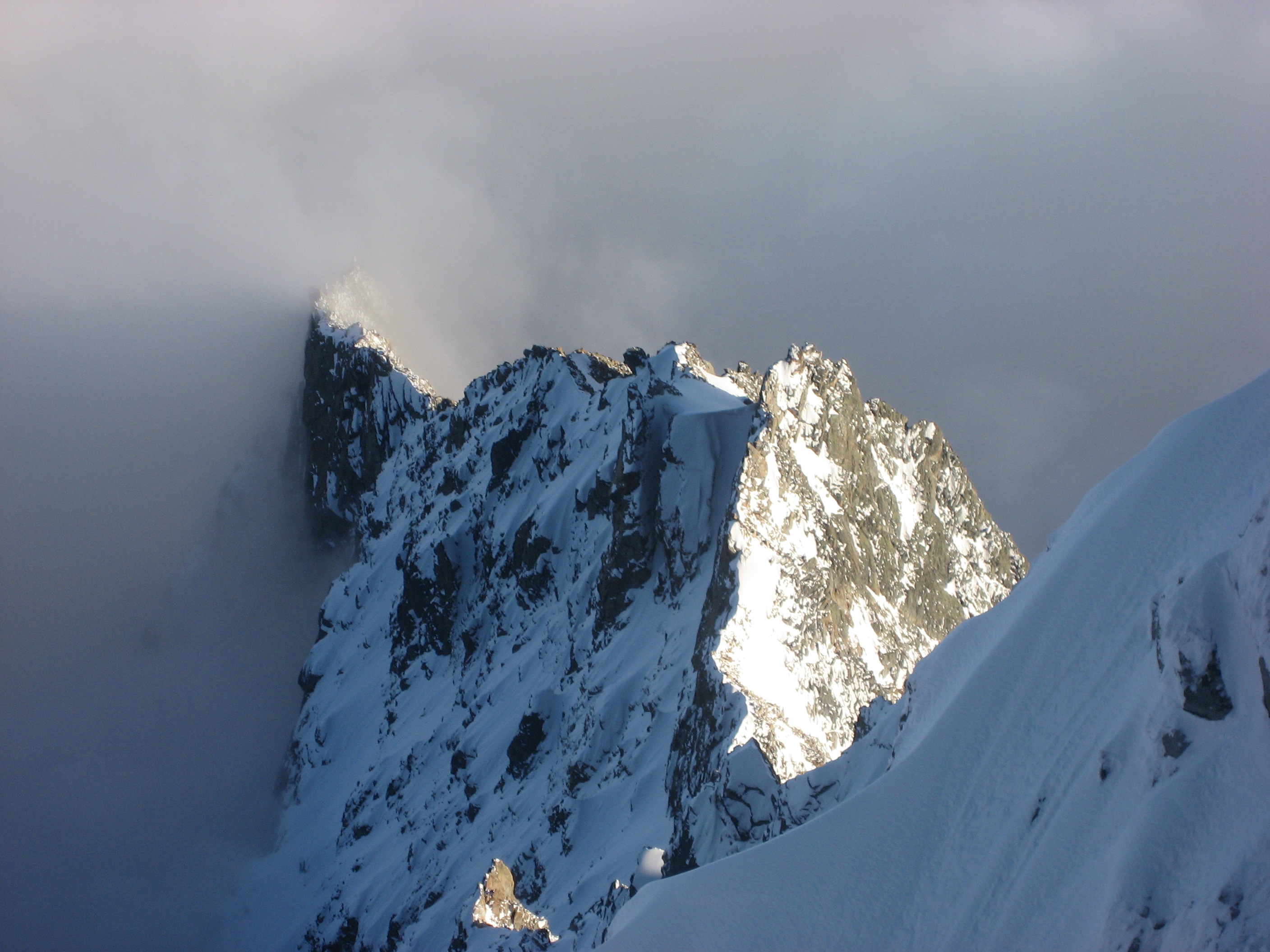 Jean est sur l’arête des Hirondelles et m’accueille en me faisant basculer de l’autre côté… en face est des Jorasses, totalement plâtrée. La quantité de neige ici est étonnante, plus de 50 centimètre de fraîche : on comprend mieux d’où venaient les coulées que nous avons essuyées dans la montée, projetées par le vent dans la face Nord. Dans ces conditions, il nous faudrait 5 à 6 heures pour gagner le sommet, contre deux heures par des conditions normales. Il est déjà 17h, nous avons mis dix heures pour sortir le Linceul et ne disposons plus que de deux heures de jour. Il est hors de question de sortir par le sommet. Il faut perdre de l’altitude et descendre l’arête des Hirondelles.