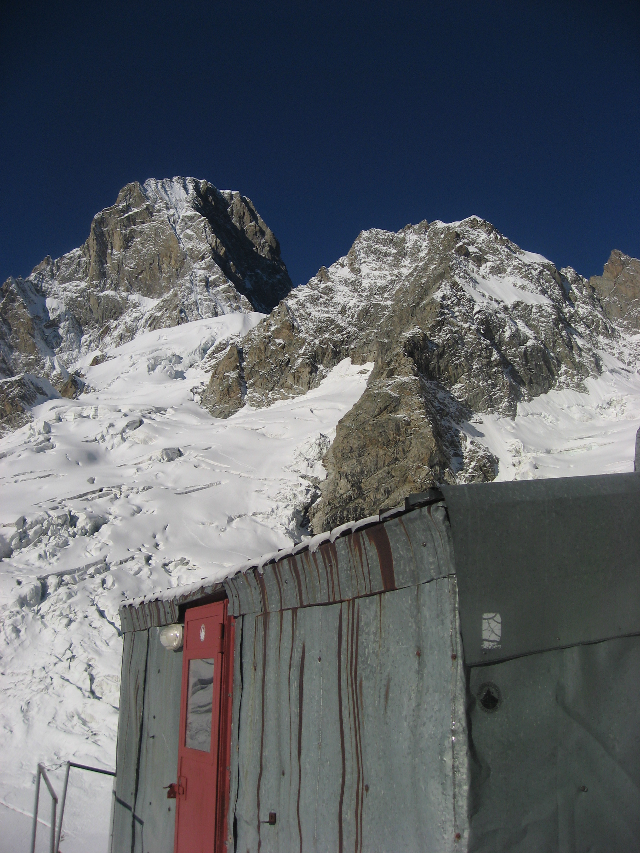 Nuit sans surprises, réveil vers 8 heures avec le lever du soleil sur la face Est des Jorasses, magnifique. Le cirque glaciaire est grandiose. Le froid matinal est saisissant mais la température se réchauffe rapidement comme le soleil vient baigner le refuge. Le temps est radieux. En regardant le glacier de Frébouze, notre trace apparaît d’ici comme le seul itinéraire possible. De nuit… Chapeau, Jean!