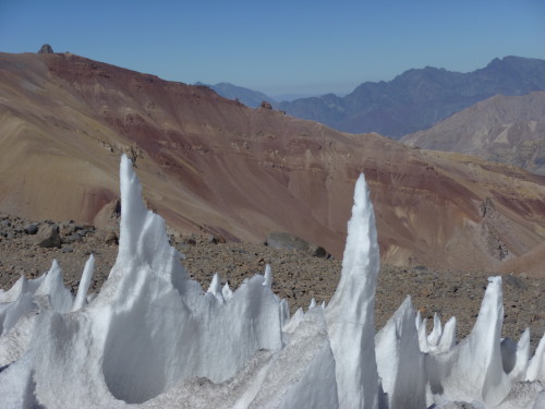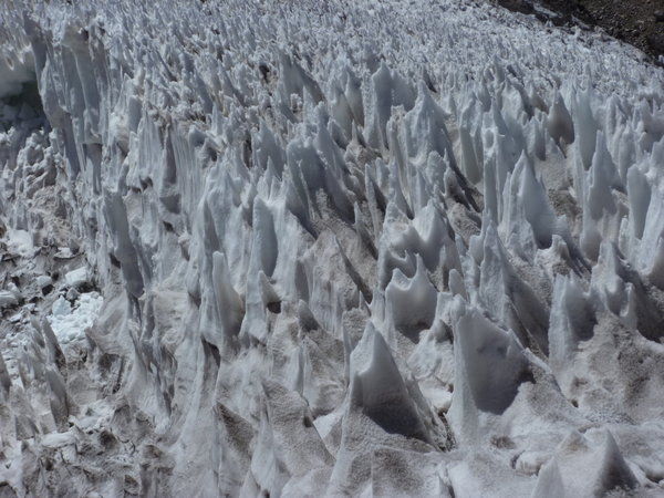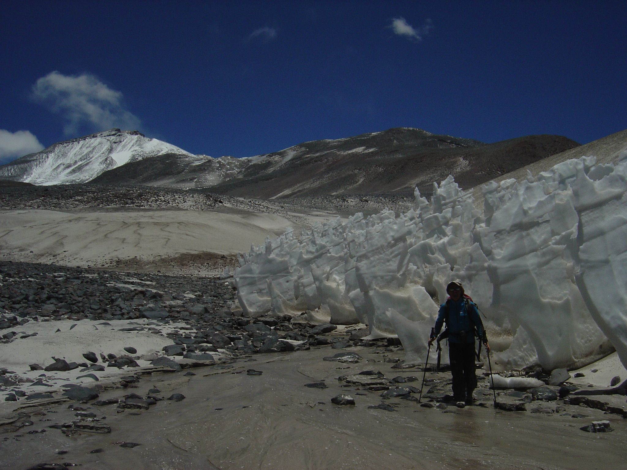 Une forme de glace particulière reçoit le nom de pénitents. J’en ai rencontré en Himalaya (Shishapangma) ainsi qu’en Amérique du Sud (au Tupungato et à l’Ojos del Salados, au Chili). Au Sajama, le plus haut sommet de Bolivie, ils se forment progressivement et deviennent particulièrement difficiles à franchir au fur et mesure que l’hiver austral avance.