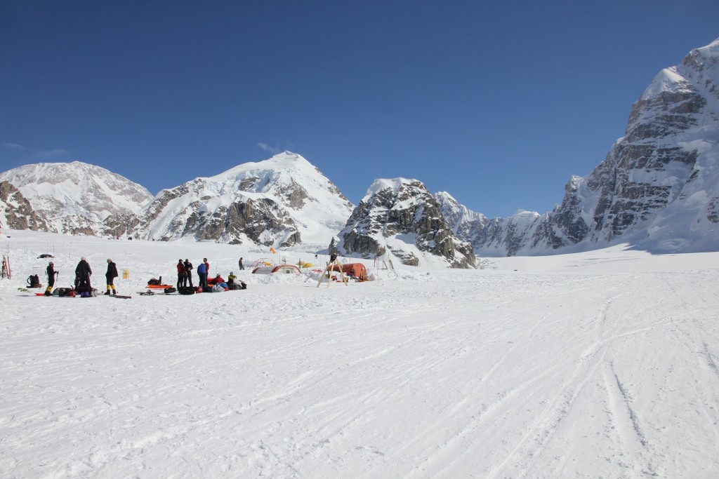 Camp de base MacKinley et son runway; de g. à droite: MacKinley, Kahiltna, Radio Control Tower, pilier nord du Hunter