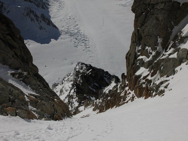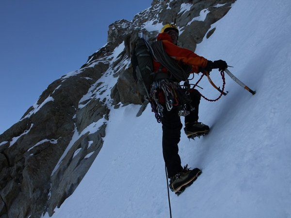 - « Bacon & Eggs » : une très jolie voie technique en glace (soutenue en 80/85°, 90° max) : le même guide très lent (15h aller-retour !) ; de la neige toute la journée ; le spindrift (petites coulées de neige légère qui vous recouvre et pénètre partout dans vos vêtements) toutes les dix minutes ; malgré cela, quel plaisir avec un sac léger sur une neige polystyrène et une glace relativement bonne ! Dommage, les photos (et celles du Hunter) sont parties avec l’appareil qui s’est crashé dans la goulotte du haut du dernier relais.