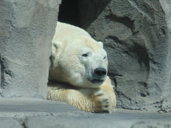 Je passe l’après-midi au zoo. Les principaux animaux qui vivent en Arctique y sont représentés. Quelques yacks sont également là ( !) ainsi que des alpagas et des tigres ( ?)… La star du zoo est incontestablement l’ours polaire ; les autres ours, bruns et noirs, sont également présents. Les trois espèces sont bien fainéantes, faisant la sieste, au grand dam des enfants. Il paraît qu’il n’est pas si rare de voir un ours aux abords voire dans les rues même d’Anchorage. Euh…