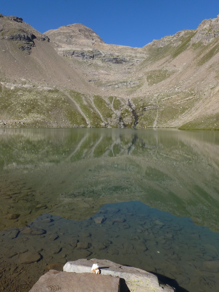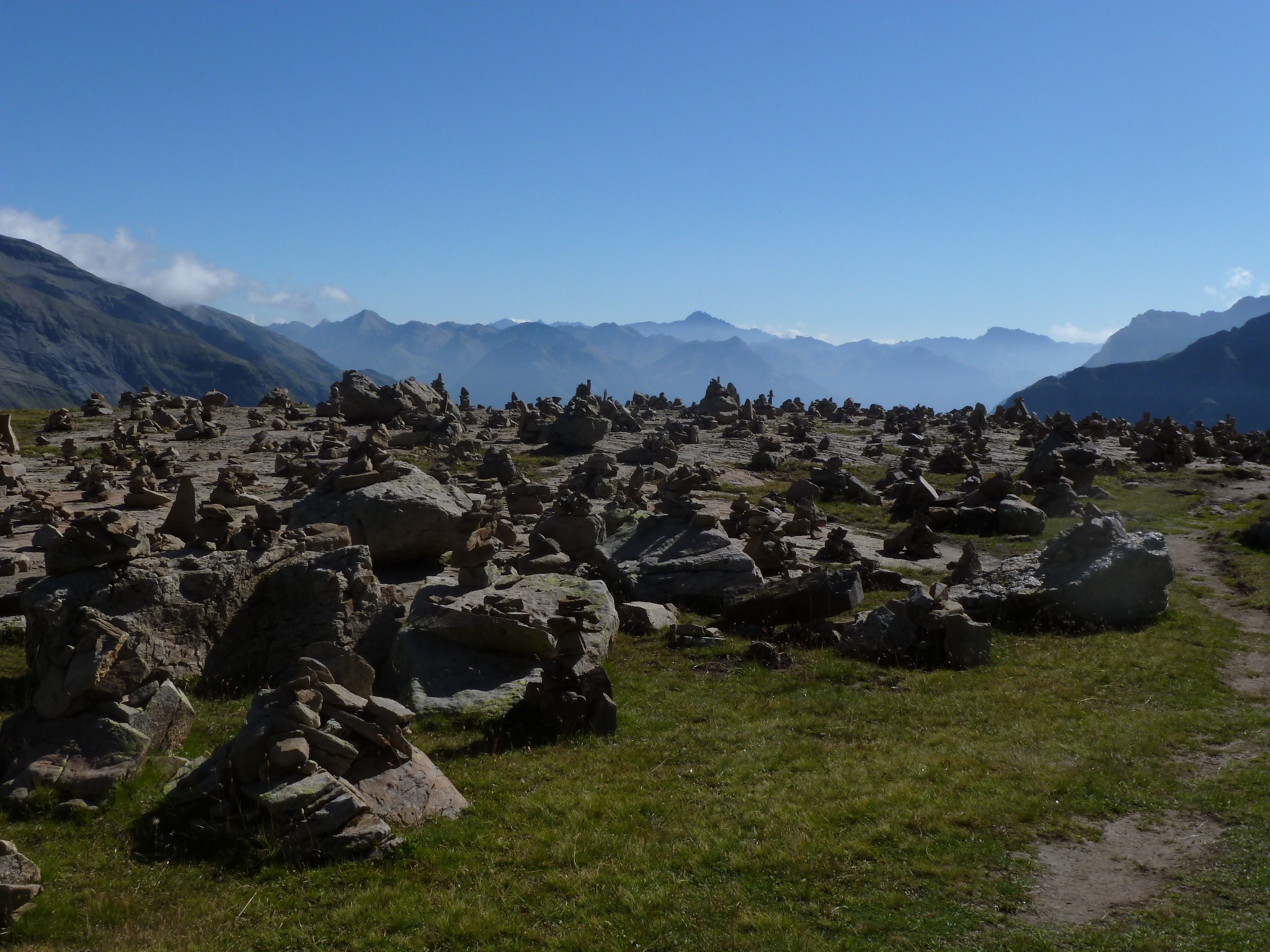 Entre les lacs Palluel et Faravel, un passage où d’innombrables cairns ont été élevés. Façon col népalais : un cairn pour un moment de bonheur.