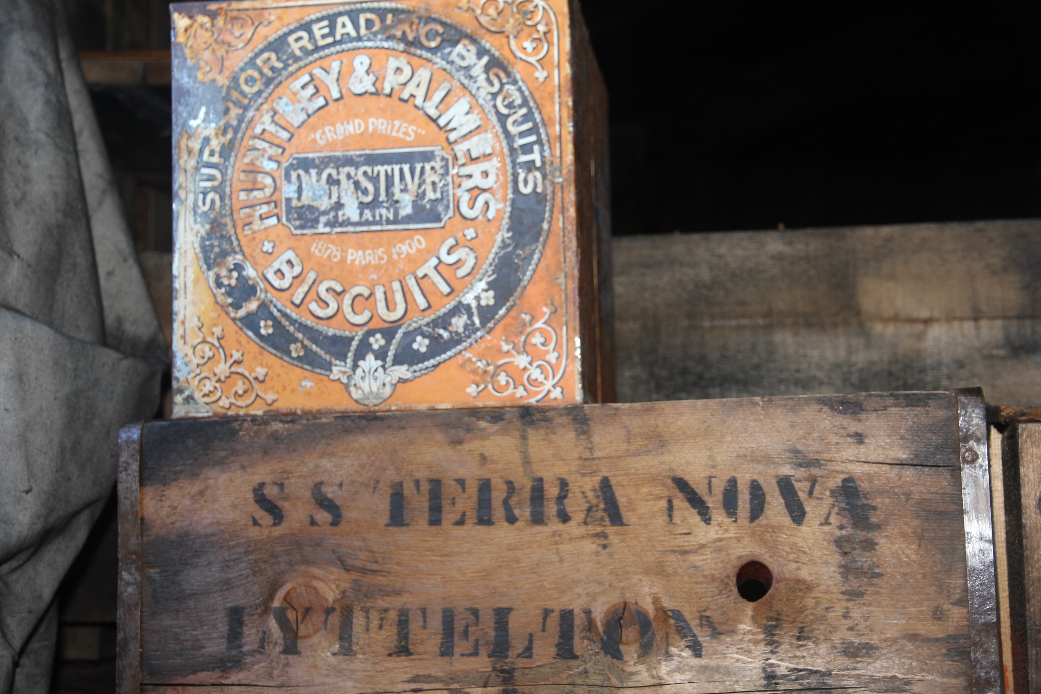 Les boîtes de cacao et de biscuits de l’expédition Terra Nova de Scott. Elles ont plus de 100 ans!