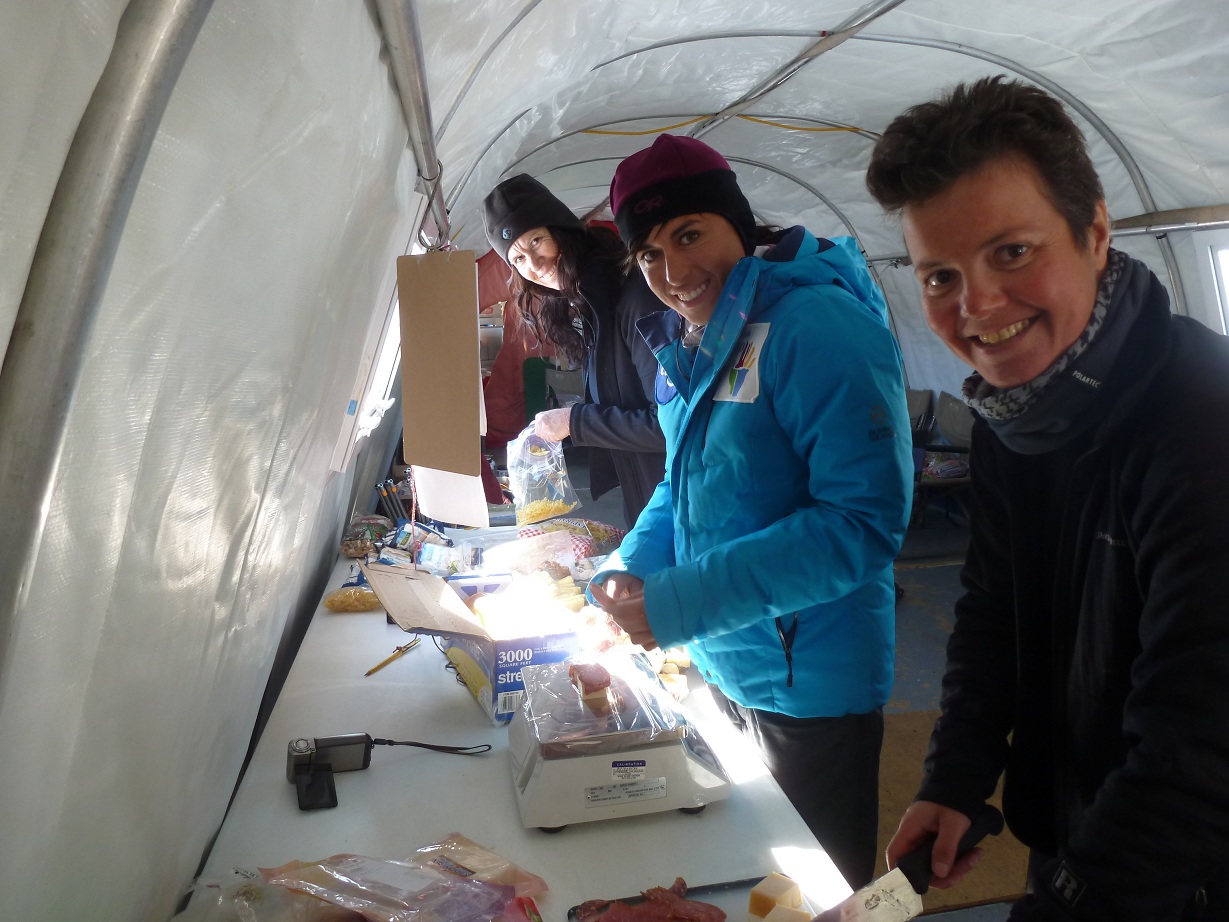 La préparation de la nourriture a plusieurs objectifs: s’assurer qu’on a de quoi passer dix jours sur la glace (soit 3 jours de sécurité par rapport au planning prévisionnel d’une semaine pour rallier le pôle), s’assurer qu’on n’emporte pas trop (la chasse au poids), essayer de coller au plus près possible aux goûts et contraintes alimentaires de chacun(e) et conditionner les aliments de façon à minimiser l’énergie à fournir pour les absorber. Eric passa une nuit aux fourneaux à préparer et mettre de la nourriture sous vide, prête à consommer: pancakes (sans gluten), œufs brouillés au bacon…