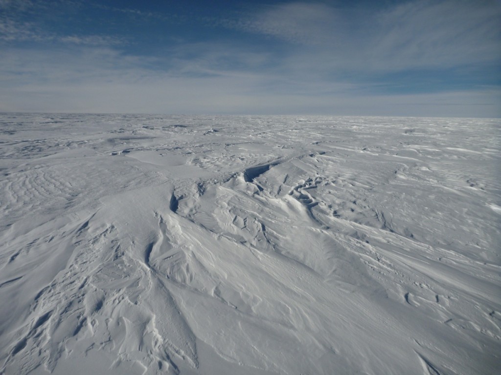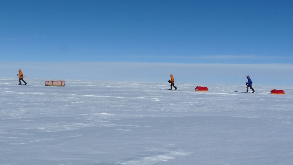 Le 22 décembre, par un vent de 70km/h, nous embarquons dans le Twin-otter. Monica, le pilote, vole jusqu’au 89° degré sud où elle nous dépose avec les traîneaux sur lesquels se trouve tout ce qui est nécessaire pour survivre quelques jours dans un environnement exigeant. Elle bat des ailes en s’en allant, pour nous souhaiter bon courage? On peut ressentir un certain moment de solitude en regardant autour de nous, à perte de vue, le désert de neige et de glace que représente le plateau polaire… Nous attendent 60 miles nautiques (110km) pour rallier le Pôle, si tout va bien…