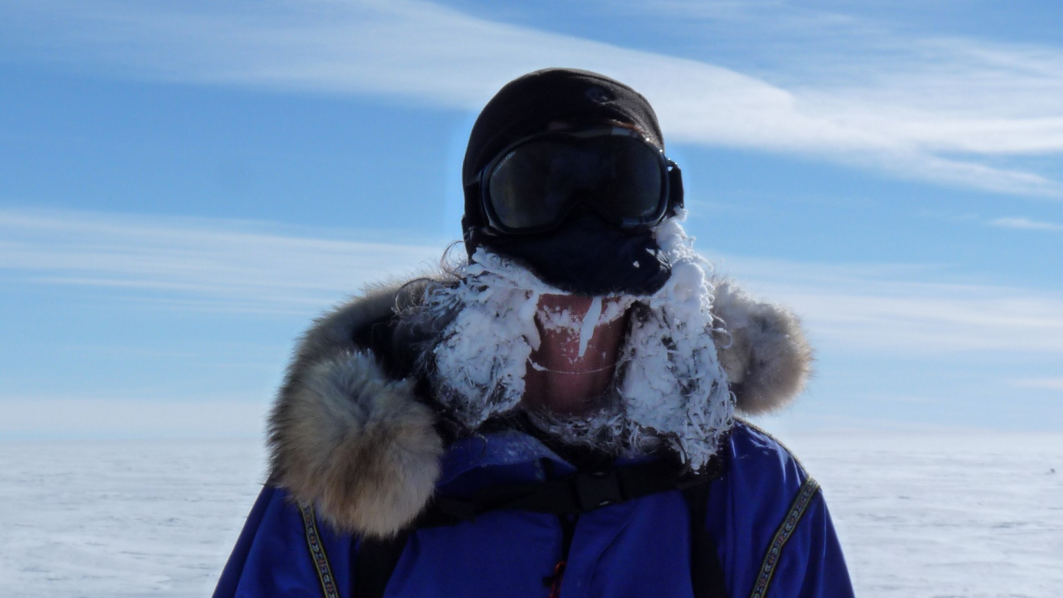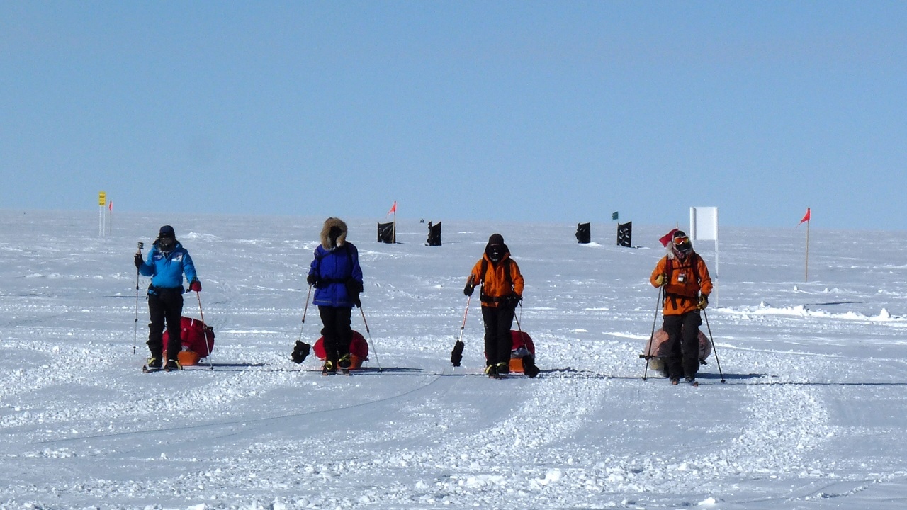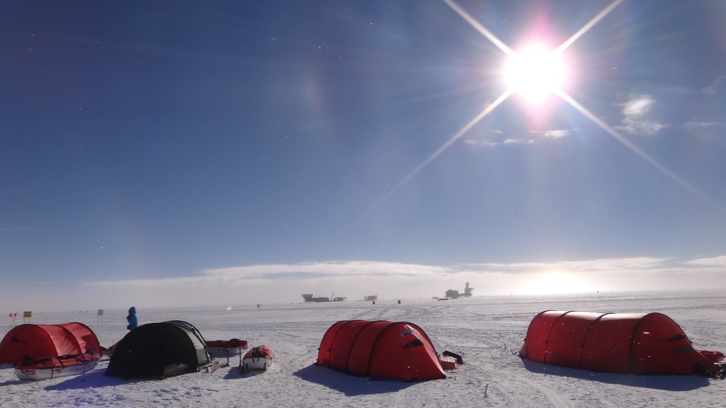 Le sixième jour, nous nous réveillons avec une certaine excitation. Si on marche bien aujourd’hui, on dormira au Pôle! La température clémente (-15° au soleil) et l’absence totale de vent réchauffent la neige. Moins abrasive, elle permet de bien glisser et nous avalons les miles. A 14h, nous déjeunons en observant au loin les bâtiments de la station scientifique américaine du pôle Sud. Ça sent bon l’arrivée! A 18h, nous saluons Scott, le manager du camp d’ALE du pôle Sud. On y est!
