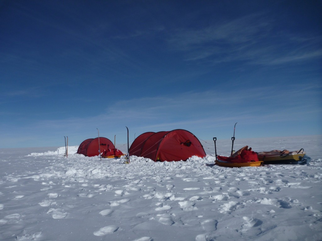 Premier campement: deux tentes, un mur de neige pour les protéger du vent, et un coin toilette (un trou en plein air avec un mur de neige pour donner un peu d’intimité). On prendra l’habitude d’en construire deux: une pour servir véritablement de toilettes et l’autre faisant office de cabine téléphonique pour Andrea qui reste en contact avec ses sponsors… Le soleil, présent toute la nuit quand il fait beau, maintient la nuit dans la tente une température très agréable.