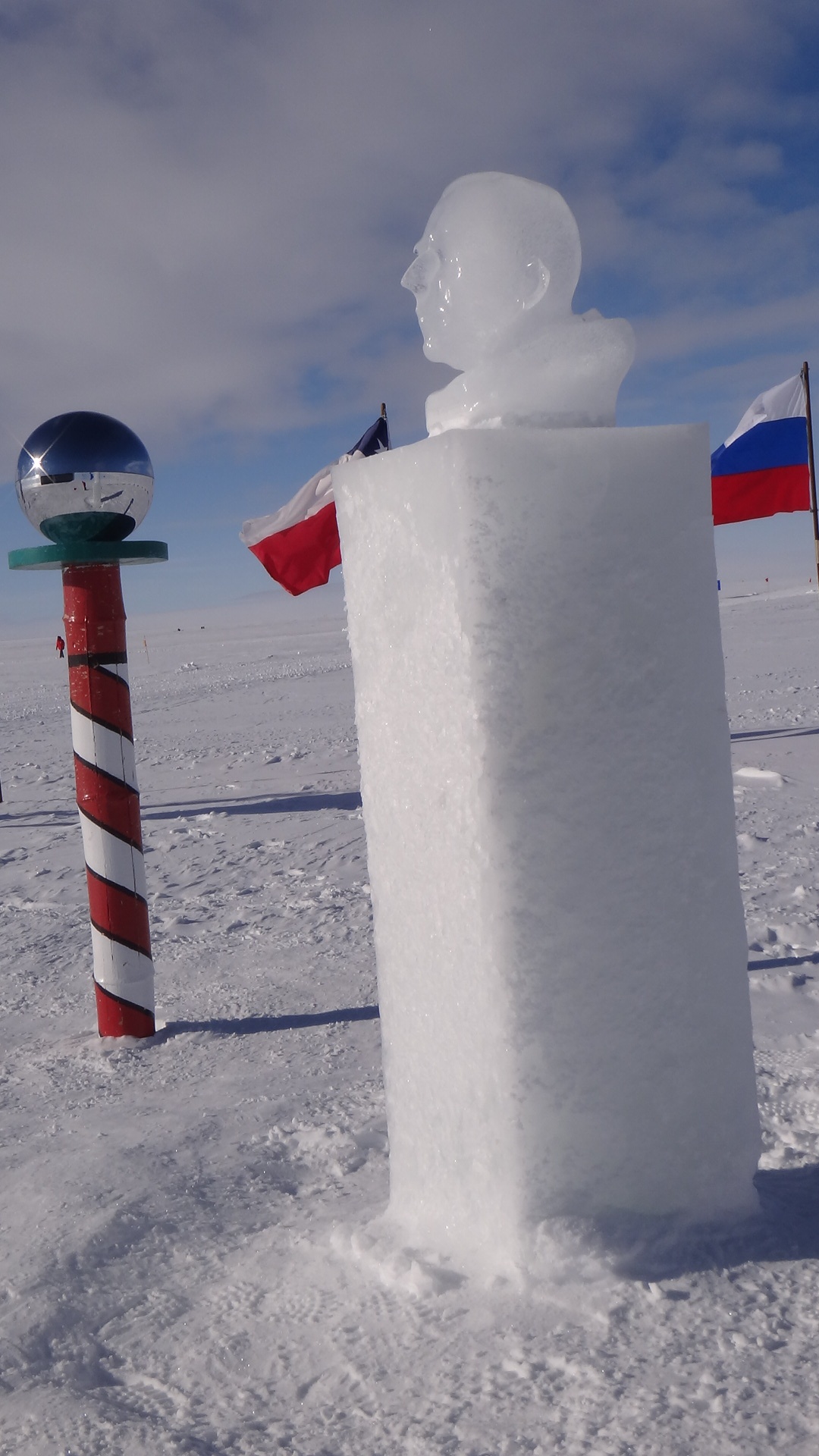 070 071-1 073Le globe et la statue en glace d’Amundsen marquent le « Pôle protocolaire ». Pas un chat en vue. Nous sommes loin du tumulte qui a du être celui des célébrations du jubilee Amundsen!
