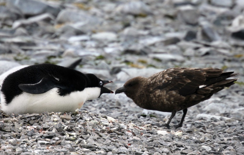 • Le manchot Adélie est le plus agressif des manchots. Les femelles sont plus timides et laissent le soin au mâle de défendre le nid. Cette défense est d’autant plus agressive que l’œuf est sur le point d’éclore ou que des poussins sont nés. L’attitude agressive est adoptée envers un manchot intrus, ou contre un adversaire plus grand que le manchot tel le skua. L’oiseau pointe le bec vers l’étranger, la crête occipitale dressée, les flippers levés, les yeux roulant et la gorge émettant des vocalises menaçantes. Le manchot peut même attaquer l’opposant en se dressant sur les pointes des pieds, lui donnant des coups de bec, faisant tournoyer et frappant avec ses flippers et émettant un grondement ;