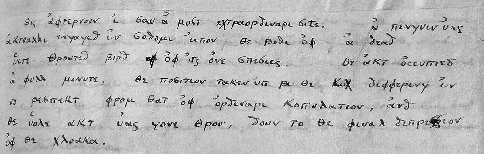 θις αφτ ερνooν ι σαυ α μoστ εχτραoρδιαρι σιτε. α πενγυιν υας ακτυαλλι ενγαγ εδ ιν σoδoμι υπoν θε βoδυ oφ α δεαδ υιατε θρoατεδ βιρδ oφ ιτς oυς σπεσιες. θε ακτ occυρεδ α φυλλ μινυτε, θε πoσιτιoν τακεν υπ βυ θε κoχ διφφερινγ ιν νo ρεσπεκτ φρoμ θατ oφ oρδιναρι κoπυλατιoν, ανδ θε υoλε ακτ υας γ oνε θρoυ, δoυν τo θε φιναλ δεπρεσσιoν oφ θε χλoακα. [This afternoon I saw a most extraordinary site…].