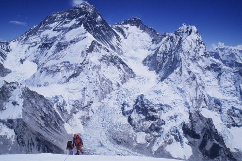 l’Everest (en noir en haut à gauche) vu depuis l’arrivée au sommet du Pumori (7161m).