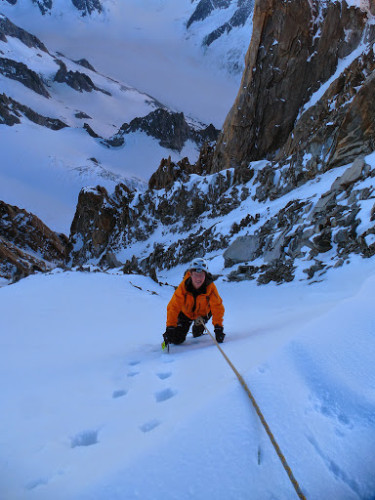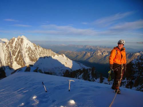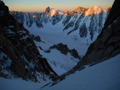 On s’équipe, on s’hydrate et c’est parti pour quelques longueurs un peu plus raides, comme je les aime, avant de retrouver l’inclinaison moyenne du couloir (45°?). On opte pour la branche de gauche, les conditions sont excellentes, nous sommes les premiers et quelques cordées nous suivent. Très beau lever de soleil, les nuages s’agglomèrent déjà sur le versant italien des Jorasses.