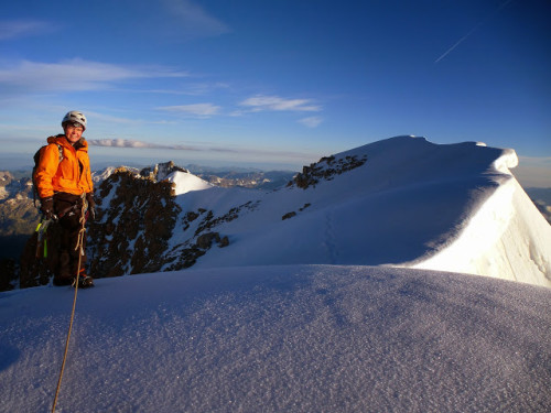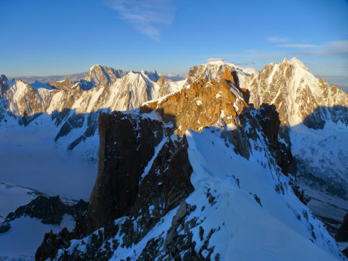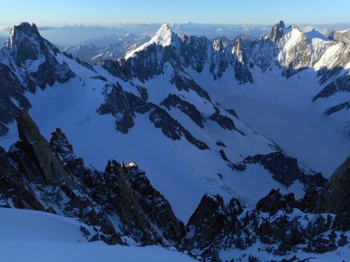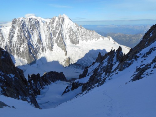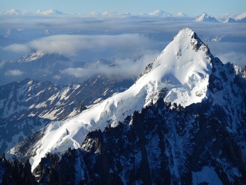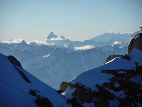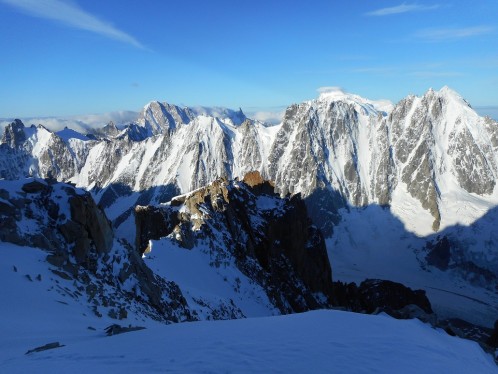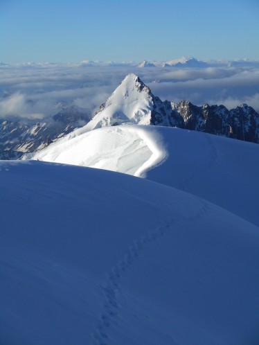 Petite corniche sans histoire pour sortir, puis des pentes débonnaires pour rallier le sommet (avant 7h), magnifique belvédère sur les sommets du massif et notamment du bassin d’Argentière. Le Dolent sort d’une mer de nuages, comme la Dent du Géant. Au loin, le Cervin en ombre chinoise.