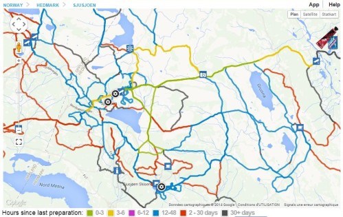 Il n’est pas besoin de forfait pour le ski de fond en Norvège. Il faut simplement payer le parking. Il n’y a pas de cabane au départ et donc personne pour vous indiquer l’état des pistes. Il faut pour cela regarder un site Internet qui indique, région par région, quand les itinéraires ont été damés pour la dernière fois: http://skisporet.no/. Les couleurs ne correspondent pas du tout au niveau des pistes mais au laps de temps qui s’est écoulé depuis le dernier passage de la dameuse. Si c’est en rouge (pas damé depuis plus de deux jours), préparez-vous au gymkhana et au rodéo et à travers les herbes folles si la neige est un peu ‘juste’, aux bosses, aux gros devers… Si c’est vert, jaune ou rose, ce sera du billard (damé depuis moins de 12h). Quoique (cf infra, Susjoen-Ljoheim)…