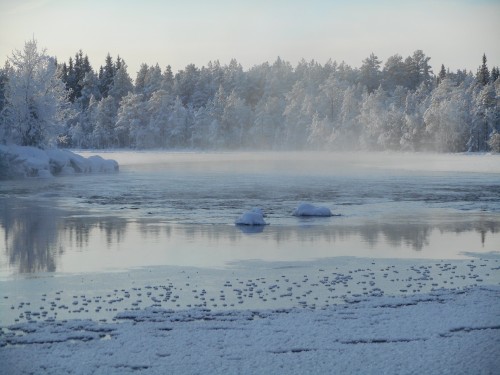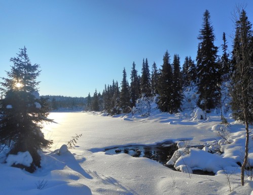 La piste était rouge sur Internet, mais je ne savais pas encore ce que cela voulait dire… Rodéo donc pour une grande partie. Peu de monde (tiens donc, étonnant!…), froid marqué (-15° au départ). Itinéraire de forêt peu fréquenté, avec de jolis points de vue sur des lacs.
