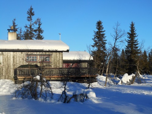 Haro sur les pistes fraîchement damées… où la neige est dure comme du béton, lustrée par le vent, après dégel et regel, et vieille de plusieurs semaines. Itinéraire exposé au vent, dans le dos pour les phases plutôt descendantes et de face pour les montées: dommage… La Birkebeinerloype mène à de grands plateaux en contrebas que l’on rejoint et traverse. Très peu de monde pour gagner le village de Ljosheim, composé de quelques cabanons entre les arbres. Le soleil fait son apprition et égaye le paysage.