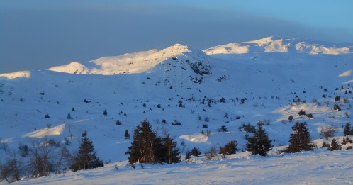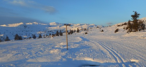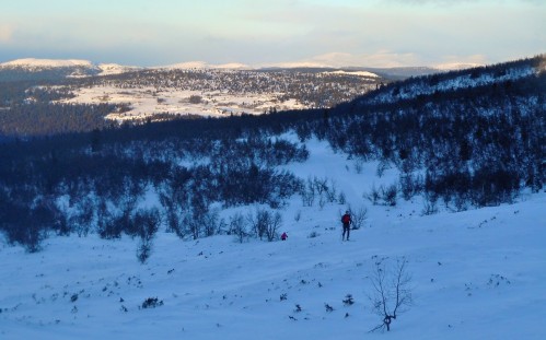 Suit un court plateau à la sortie de la forêt, puis un paysage lunaire, toujours en montée pour atteindre une sorte de col où on retrouve le soleil. De là, il faut encore monter pour rallier le haut des pistes du domaine de Skei. Ouf, maintenant la promesse d’une belle descente! C’est en fait un grand faux-plat, avant de remonter un  peu (!) sur un col pour basculer versant Skei.