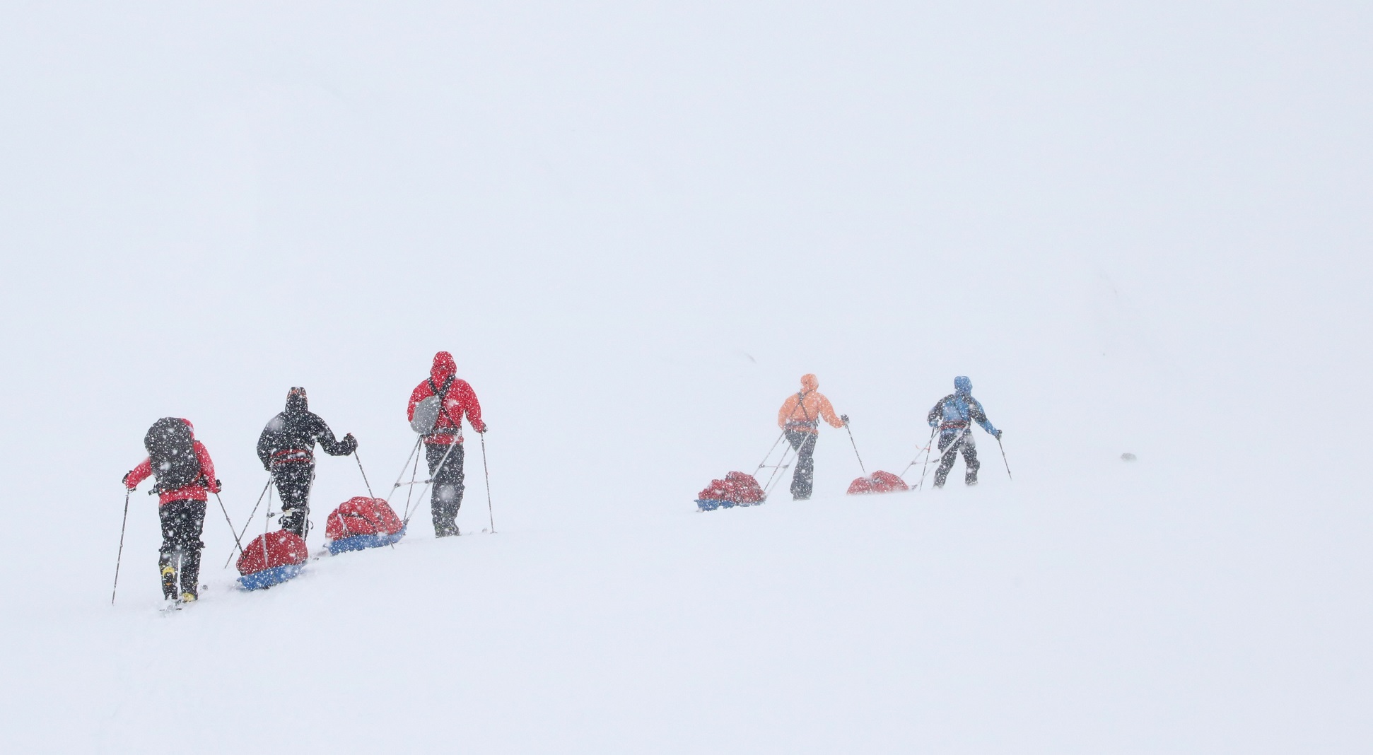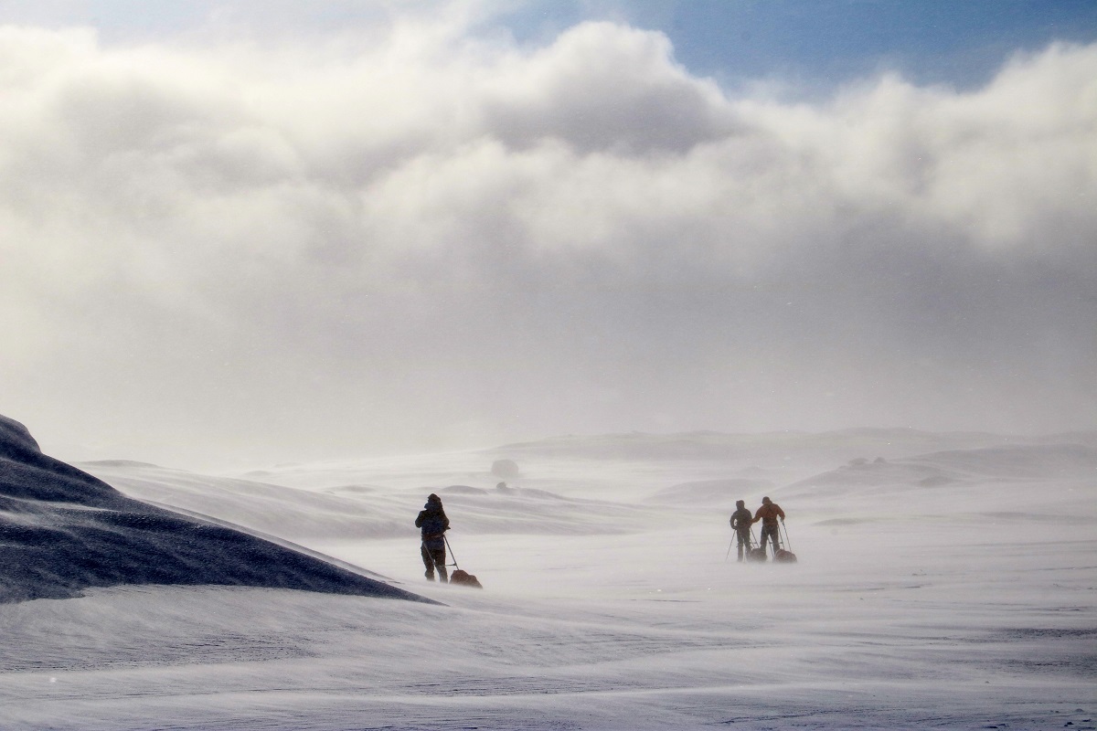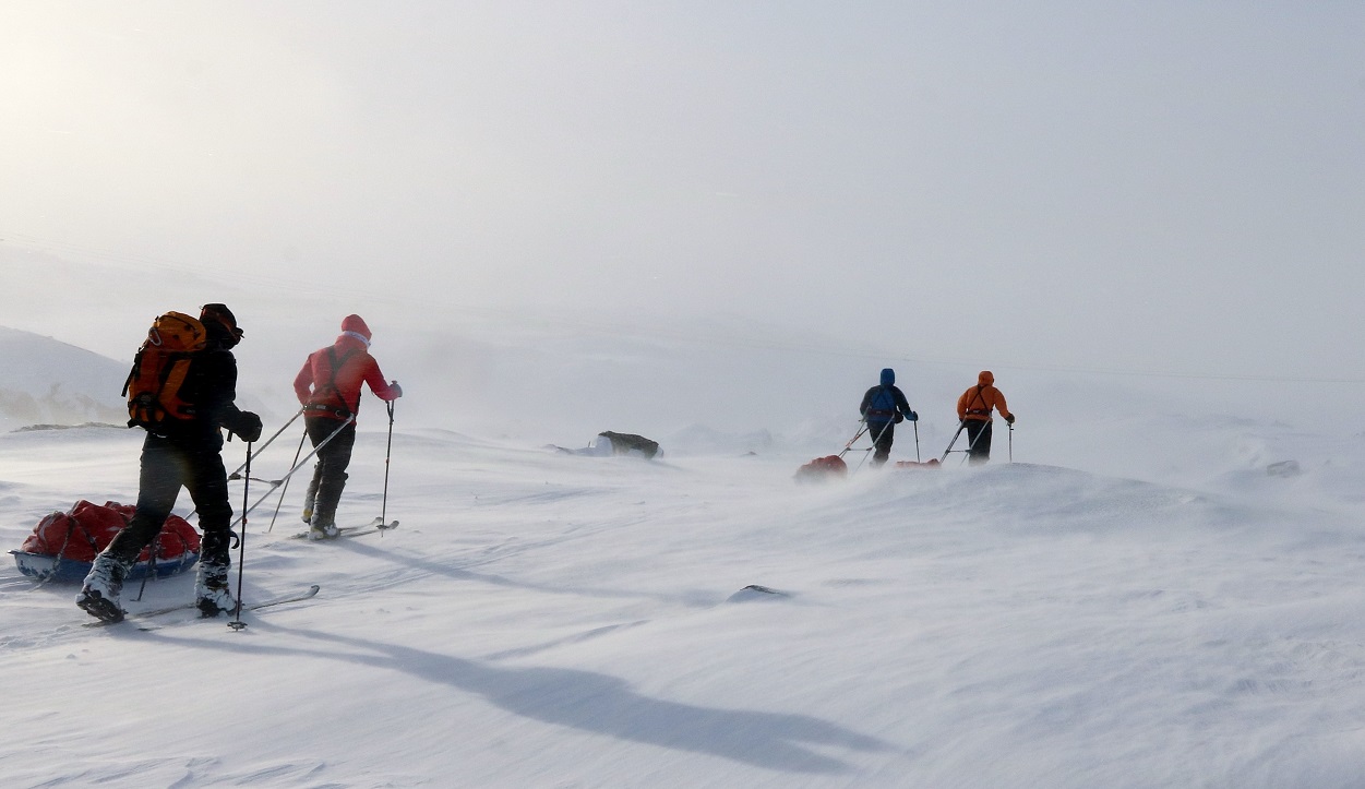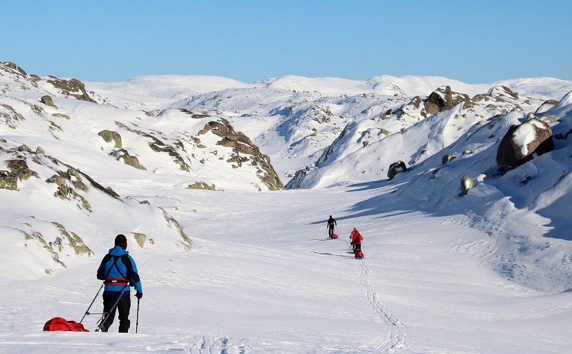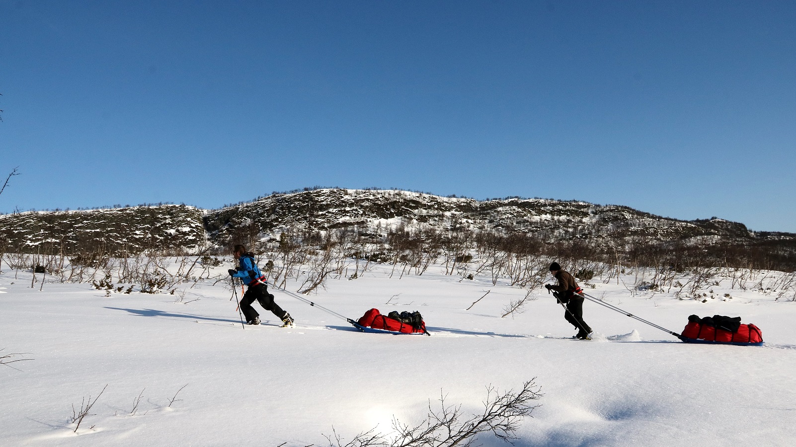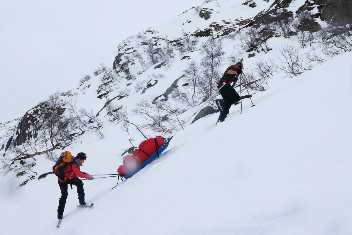 Pour autant, les traîneaux sont plus lourds qu’attendu, puisqu’il n’y en a pas autant que de participants. Le terrain montagneux du Sorlandet est sensiblement différent du Groenland ou de l’Antarctique où l’on rencontre plutôt des faux plats montants et des pentes douces, qui autorisent un système de tirage souple (de simples cordes). Au Sorlandet, le terrain est plus vallonné avec le passage de fréquentes pentes raides avec des parties en dévers. Le système de tirages doit être adapté avec (i) des bras rigides reliés au harnais et au traîneau, et (ii) une ou deux personnes ‘libres’ de leurs mouvements pour aller aider ceux qui tirent, voire remettre dans le bon sens un traîneau qui s’est retourné.