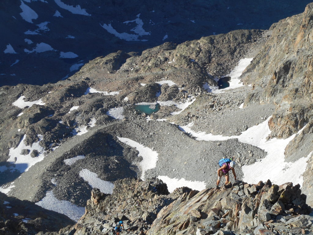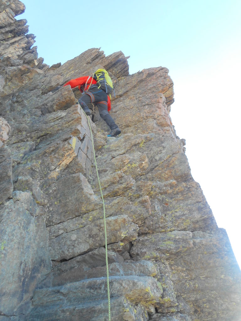 Comme le soleil illumine l’horizon, nous parvenons à la zone en rocher : 600 mètres d’escalade guidée par les marques jaunes, essentielles en cas de brouillard. Cheminées, arêtes, zones faciles où l’on marche plus qu’on ne grimpe : le cheminement suit les failles de cette immense montagne.