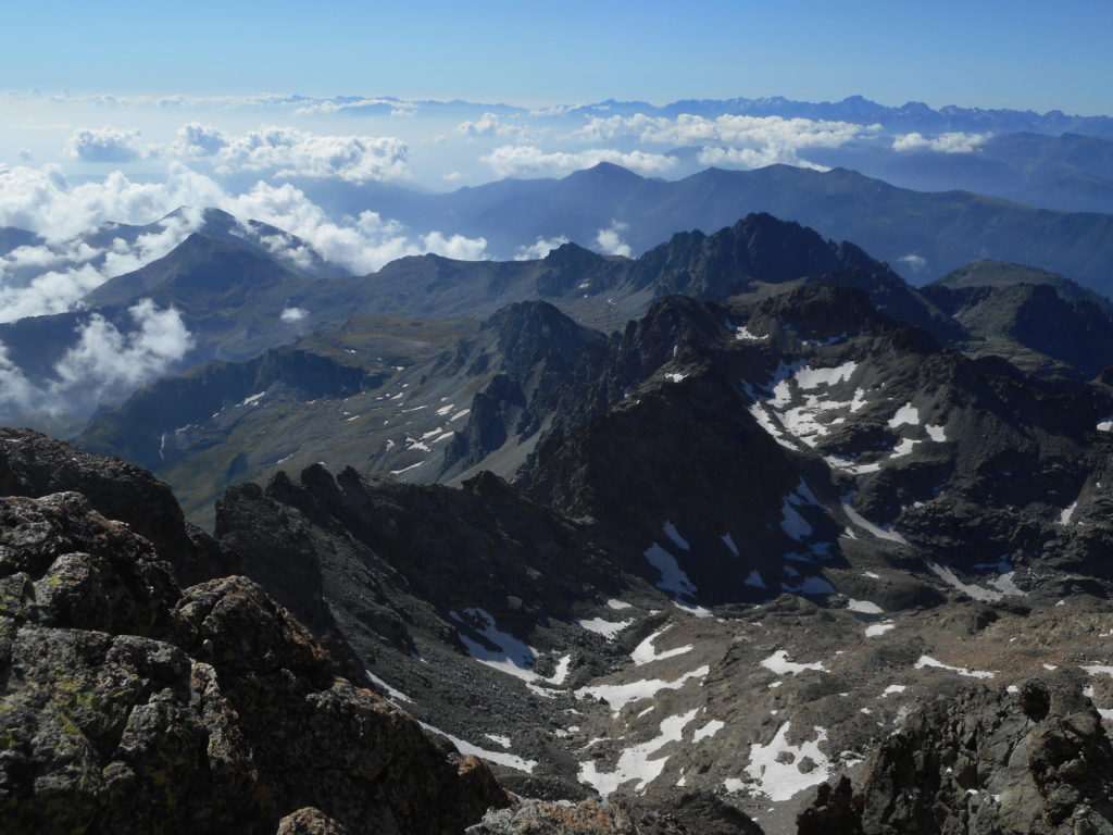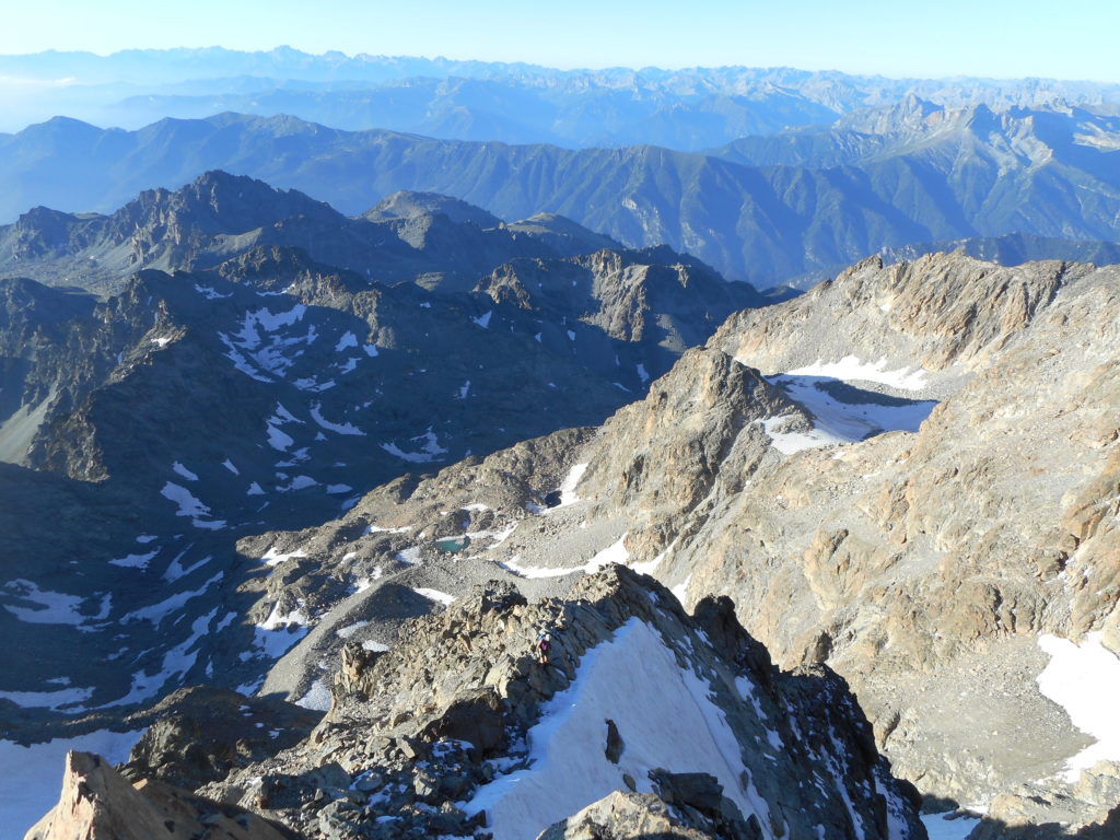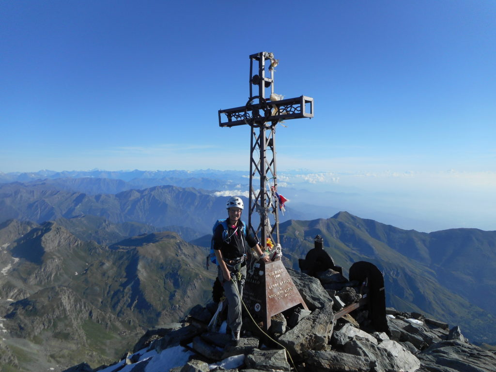 Sommet à 8h45 : les vues sont magnifiques sur les Écrins, mais aussi la Vanoise, le Mont Blanc et les célèbres cimes du Valais, Cervin et Mont Rose.