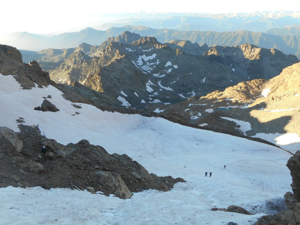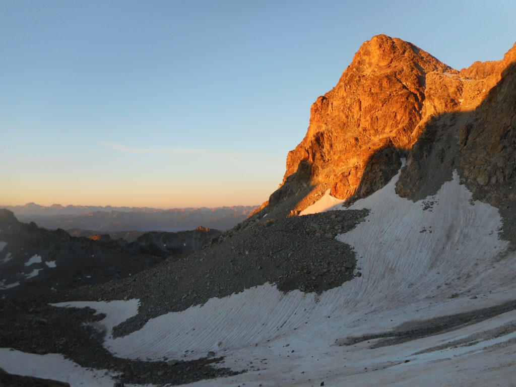 Lever à quatre heures du matin et départ dans la foulée pour monter au col des Salcettes, auquel on accède par un chemin raide (bâtons recommandés!) puis des passages rocheux faciles équipés de câbles. Il fait encore nuit comme nous nous engageons dans la grande combe qui mène aux contreforts de la montagne. Pas grand monde , quelques frontales devant nous qui sont parties d’un autre refuge. Les névés sont en neige bien dure et les crampons sont indispensables.